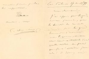Camille SAINT-SAËNS. L.A.S. avec dessin, Las Palmas 17 avril 1899, à Paul Taffanel ; 3 pages et demie in-8 (fentes aux plis réparées), enveloppe..Il le remercie pour l’exécution de son Requiem par la Société des Concerts : « mon cher...
