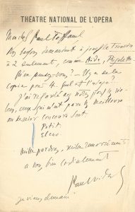 conduites de leurs concerts. 24 septembre 1898. « La reprise d’Aïda a bien marché, l’orchestre a été superbe, les artistes m’en ont fait de toutes les couleurs une fois lâchés devant le public […] mais l’ensemble a été satisfaisant »…. [8 décembre 1898]. « Le ballet marche bien. […] Je persiste à croire qu’il faudrait donner une soirée de liberté à l’orchestre qui commence à montrer les dents. Vous aviez bien manigancé ça avec Gailhard, je vous appuierai ferme »… – « Nos bassons demandent à jouer Le Trouvère à 2 seulement, comme Aïda, Rigoletto. Qu’en pensez-vous ? Il y a de la copie pour 4. Quel est l’usage ? »… [12 février 1900] : « Lancelot a bien marché, surtout à la générale. L’orchestre a été très gentil. 3 violons avaient mis des remplaçants, nous leur avons mis des amendes, ça a compensé ! Le succès a été celui qu’on pouvait prévoir »… – « Le matériel du ballet de La Burgonde est au bureau de la copie. La partition est à Caen, mais on va me la renvoyer immédiatement. Ci-joint la tablature. La batterie est considérable. Le Célesta de la danse de Bayadère est très important »… Paris 1er juillet 1900. « L’exécution du ballet de La Burgonde jeudi dernier, au Trocadéro, a été la plus grande joie de ma vie de compositeur »… Il est question du remplacement de Taffanel pour raison de santé. [28 avril 1901]. « Tout s’est bien passé, l’orchestre a été admirable d’attention, j’ai surtout dirigé le chant j’espère que vous avez pu mener à bien le concert d’aujourd’hui »… [8 juillet 1902]. Prière de bien vouloir conduire la reprise d’Aïda la semaine suivante (minute de réponse positive de Taffanel au dos)… [25 novembre 1902]. Vidal doit à son tour remplacer Taffanel pour les Barbares : « Je les conduirai mercredi et même vendredi si vous n’êtes pas d’attaque »… [21 mai 1904], sur une soirée qui se terminera par un hommage à Verdi « autour d’un monument fictif, on joue des fragments de la marche et du final du II d’Aïda. Il me semble que votre place est au pupitre en cette circonstance »… Nouvelles de santé, prises de rendez-vous, envoi de partitions, etc. On joint une L.A.S. à Madame Taffanel (1899) et une minute de réponse de Taffanel.
