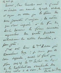 être admis à une des prochaines auditions : « J’aurais prêtes toutes les parties gravées »… 14 novembre 1894 : « Quand on écrira une nouvelle symph[onie] orchestre et orgue, on verra que la forme des deux premières s’impose ; de même que s’est imposée à la fin du siècle dernier la forme consacrée aujourd’hui des quatre parties entraînant les mêmes tonalités, à peu près »…
