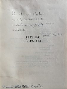 Maurice CARÊME. Petites Légendes (Éditions du Sablier, Collection de la Bouteille à la mer, 1949) ; in-12, broché (lég. mouill.)..Édition originale, un des 700 exemplaires sur Alfa mousse des papeteries Navarre (n° 557)..Envoi autographe...