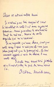 Octave MIRBEAU (1848-1917). L.A.S., [vers 1895, à Laurent Tailhade] ; 1 page in‑8..Il n’était pas inquiet quant au résultat de son duel « avec ce jeune gamin », mais sa dépêche l’a rassuré. « Je ne regrette qu’une chose, c’est...