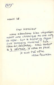 Jean PAULHAN (1884-1968). L.A.S., mardi 28 [janvier 1958, à André Boucourechliev] ; demi-page in-8 à en-tête de la nrf..« Nous attendons bien impatiemment une chronique ou une note de vous. Sur le ballet de Sagan ? sur “Domaine...