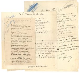 Poèmes. 19 poèmes autographes signés, fin XIXe siècle (qqs marques d’imprimeur)..Léonce Bénédite (Fantaisie crépusculaire), Georges Docquois (La Chanson du Porche pour l’acte III de La Rôtisserie de la Reine Pédauque), Emmanuel des...