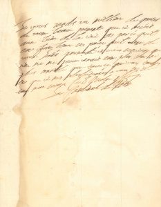millier de graces de votre beau presant que je reçois avec bien de la joie et parce qu’il est fort beau et parce quil vient de vous. Soiés persuadé je vous conjure que rien ne me peut jamais estre plus cher ni plus sensible que tout ce qui vous touche, et que je suis absolument a vous et de tout mon cœur »…