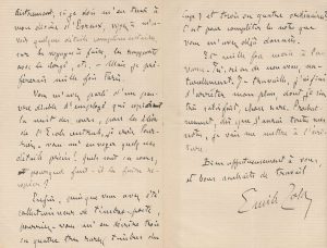 juin 1881. Il remercie Huysmans de ses « bons renseignements » (sur les architectes diocésains), mais demande encore des précisions : « Mon architecte, d’une importance médiocre, habite Paris, rue de Choiseul sans doute, et se trouve être de la paroisse de Saint-Roch. Si j’en fais l’architecte du diocèse d’Évreux, par exemple, pourrai-je l’employer à des réparations dans l’église Saint-Roch ? Ce serait sans doute lui donner une trop grande situation que de le prendre pour Paris ? Voyez pourtant s’il n’y aurait pas moyen, s’il n’existe pas à Paris des architectes de paroisse, et quels seraient alors leurs appointements, leurs occupations, etc. Autrement, si je dois m’en tenir à mon diocèse d’Évreux, voyez à m’avoir quelques détails complémentaires, sur les voyages à faire, les rapports avec le clergé, etc. – Mais je préfèrerais mille fois Paris ». Il se souvient aussi qu’il lui avait parlé d’un pauvre employé qui recopiait la nuit des cours pour les élèves de l’École centrale, et il demande des détails précis : « Quels sont ces cours, pourquoi les faire recopier ? Enfin, puisque vous avez été collectionneur de timbres-poste, pourriez-vous m’en décrire trois ou quatre très rares (timbres du Cap) et trois ou quatre ordinaires ? C’est pour compléter les notes que vous m’avez déjà données ». Il le remercie de son aide : « Je travaille, j’ai fini d’arrêter mon plan, dont je suis très satisfait, chose rare. Prochainement, dès que j’aurai toutes mes notes, je vais me mettre à l’écriture »….24 juin 1881. Il le remercie pour l’envoi d’informations sur l’église de Saint-Roch et les maisons adjacentes : « J’avais l’extérieur des deux maisons, mais je n’osais pas trop me risquer. Ce que vous me dites me suffira à rêver le reste. Pourtant, si par hasard votre ami lâchait des détails plus précis sur la vie de ce petit monde, vous me donneriez ça de vive voix, lorsque vous me ferez le plaisir de venir me voir. Je fais mes trois petites pages par jour, ce qui est mon train-train habituel ». Il séjournera à la mer en août et septembre, où il tâchera « d’abattre de la besogne ». Il plaint Huysmans, « réduit au séjour à la campagne que vous n’aimez guère, je crois. Le déplacement sera ennuyeux, mais vous travaillerez mieux peut-être. […] Je trouve l’été mélancolique : voici pour moi la saison noire »…
