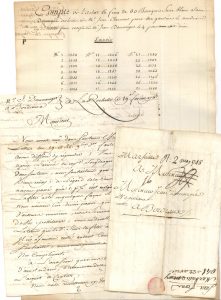 postales..Correspondance commerciale, qui débute par une lettre de son demi-frère Pierre Dommenget, à propos d’une métairie de la succession paternelle : celle-ci devait permettre à Jean Dommenget de s’établir à Bordeaux, sur les Chartrons, comme négociant en vins, mais aussi pour les produits venant des colonies. Cette correspondance provient en grande partie de la Hollande (Rotterdam, Berg, Amsterdam, Utrecht), où Jean venait de passer quatre ans, mais aussi de Plymouth, Londres, Lisbonne, Venise et de ports français : Saint-Malo, Libourne, Bayonne, Marseille, La Rochelle... Il y est question de commandes et tarifs de denrées, et surtout de vins, des prises de bateaux, de nouveaux bateaux armés, des capitaines et des équipages, des risques des transports maritimes par temps de guerre, etc.