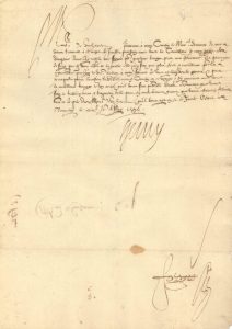 écrite du camp de Travecy, à la fin du siège de La Fère [la ville capitula trois jours plus tard, le 16 mai 1596]..« J’ordonne à mon Cousin le Maral d’Ornano de me venir trouver à ce moys de Juillet prochain avec toute la Cavallerie de mon pays de Dauphiné dont j’ay resolu me servir pour quelque temps pres ma personne et parce que je scay que si vous estes de la partie, elle n’en sera que plus forte & meilleure pour la cognoissance que j’ay de vre valeur à mon service je vous ay bien voulu exhorter & prier de ne perdre point loccasion d’assister mond. Cousin en ce voyage & d’y amener avec vous la meilleure trouppe de vos amis qu’il vous sera possible vous asseurant que vous serez le tres bien venu »…