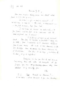 retournements : « Non, tout de même, pas Jean-Paul. Je vais tâcher de chercher un autre mot, ce que j’aurais peut-être fait si ma préparation eût été aussi vigilante que d’ordinaire. Si je trouvais, j’espère que cela couperait court. Car pour la “Condition de possibilité” comme vous dites, pour l’exploitation de la possibilité structurale pour le oui miuex. Elle a été si bien annoncée qu’elle est développée dans mes derniers séminaires sur l’identification. […] Laissez-moi vous dire que tout le reste de ce que vous assurez dans cette lettre est incroyable et que j’espère que vous n’y reviendrez pas ». Il ajoute : « Descente en flammes ?... À vous relire, je me demande ce que vous cherchez. »