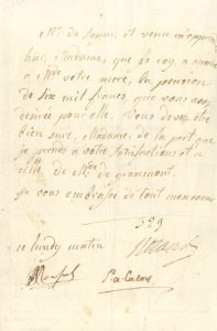 accordé a Mde votre mere, la pension de six mil francs, que vous avez desirée pour elle, vous devez etre bien sure, Madame, de la part que je prends a votre satisfactions et a celle de Mde de Grammont. Je vous embrasse de tout mon cœur. ».[Geneviève de Gramont, comtesse d’Ossun (1751-1794), dame d’atours et amie intime de Marie-Antoinette, était la fille de Béatrix de Choiseul, duchesse de Gramont (1734-1794), sœur du ministre Choiseul ; elle fut guillotinée, après sa mère, pour n’avoir pas dénoncé la fuite de la Reine.].Cette lettre a été examinée à l’époque révolutionnaire, et porte les signatures de Jean-Marie Roland de la Platière, Pierre-Antoine Laloy et Roussel.