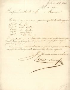 Robert SURCOUF (1773-1827) marin. L.S., Saint-Malo 26 octobre 1816, à MM. Desbouillons fils, à Rennes ; 1 page in-4, adresse..Commande de toiles : « 1300 fils », « mélis double », « id. simple », « rondelettes » et « 4 fils...