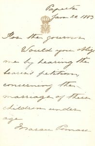 TAHITI. Marau Taaroa (1860-1935) dernière reine de Tahiti, épouse de Pomaré V. L.A.S. « Marau Pomare », Papeete 22 janvier 1883, au gouverneur [Nicolas Morau] ; 1 page in-8 à son chiffre couronné ; en anglais..Prière d’écouter la...