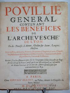 POUILLÉ GÉNÉRALE contenant les Bénéfices de l'Archevesché de Lyon, et des Diocèses d'Autun, Challons sur Saosne, Langres & Mascon. Paris, Alliot, 1648. In-4, veau du temps. Comptabilité de l'Archevêché, nature des bénéfices, revenus...