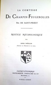 THEOLIER (H) - La Comtesse De Charpin-Feugerolles, née de Saint-Priest. Saint-Etienne, Théolier, 1884. Grand in-8, dem. maroquin tabac, le dos à nerfs orné. Grand papier.