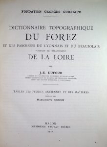 DUFOUR (J. E.)- Dictionnaire topographique du FOREZ, et des paroisses du Lyonnais et du Beaujolais formant le département de la LOIRE. Macon, Protat, 1946. Grand in-4, relié en dem. basane rouge, le dos à nerfs orné de motifs dorés.