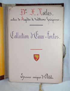NOËLAS (Docteur Frédéric). Collection d'eaux-fortes. Epreuves uniques d'artiste. Roanne, , s.d. [circ. 1870-1880]. Grand in-8, en feuilles, portefeuille à lacets recouvert de tissu provençal. "Eaux-fortes [faux-titre] // Dr F. Noëlas,...