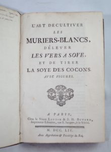 LA SOIE À LYON. L’Art de cultiver les MURIERS-BLANCS, d’élever les Vers à Soye (sic) et de tirer la Soye des Cocons. Avec figures. A Paris, Lottin, 1744. In-8, veau marbré et glacé du temps, dos à nerfs orné. Bel exemplaire.