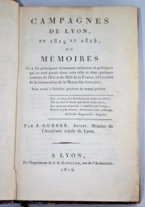 GUERRE (J) - Campagnes de Lyon, en 1814 et 1815, ou Mémoires sur les principaux éventements militaires et politiques qui se sont passés dans cette ville … A Lyon, Kindelemm, 1816. In-8, dem. bas. époque. Recherché, mais introuvable. ...