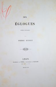 DUPONT (Pierre). Dix Eglogues. Poèmes Bucoliques. Lyon, Pinier, Successeur de Richard, 31 rue Tupin, 1864. Petit in-4, demi-chagrin vert sombre, dos à 5 nerfs avec caissons et fleurons dorés Bel exemplaire.