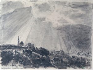 DREVET (Joannès). Les Marches.. 1929. Baguette chantournée dorée, passepartout sépia, fond beige avec filet doré [sans verre] Lavis d'encre de chine, situé et daté 1929, signé en bas à gauche. L'effet de soleil perçant à travers les...