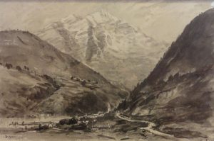 DREVET (Joannès). Paysage de Maurienne.. s.d.. sous passe-partout avec marquise dorée, cadre doré ►Très belle aquarelle originale signée en bas à droite et située "PAYSAGE DE MAURIENNE". Les maisons en surplomb de la rivière font bien...