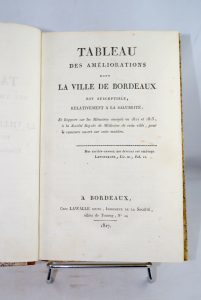 (BORDEAUX) - Tableau des améliorations dont la Ville de Bordeaux est susceptible, relativement à la salubrité… A Bordeaux, Lawalle, 1817. In-8, reliure de demi veau, charnière faible, tranches jaunes. Reliure époque. Exemplaire très...