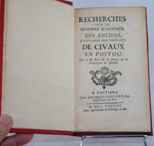 ROUTH (Bernard) - Recherches sur la manière d’inhumer des anciens, à l’occasion des tombeaux de CIVAUX en POITOU. A Poitiers, Faulcon, 1738. In-8, en dem. maroquin rouge, les plats en percaline à grain long de la même couleur, rel....