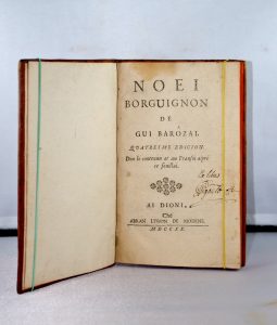 (BOURGOGNE) Noei Borguignon de GUI BAROZAI, don le contenu mat an Fracoi aipré ce feuillai.. Ai Dioni, ché Abran Lyrobn, de Modene, 1720. In-8, veau du temps. Très bon exemplaire dans a première reliure.