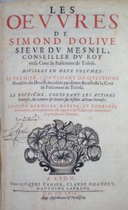 (TOULOUSE) OLIVE (Simon d’) - Les Œuvres de Simond d’Olive, Seigneur du Mesnil, conseiller du Roy en sa Cour de Parlement de TOLOSE. A Lyon, Iacques Canier, 1657. Fort in-4, veau du temps. Ces textes réglaient la vie judiciaire dans les...