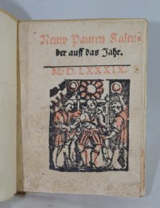 ALMANACH. Neuw Pauren Kalender auff das Jahr M.D.LXXXIX. [Rorschach, Leonhard Straub], 1589, in-16. 15 (sur 16) feuillets, vélin souple moderne ►Rare petit calendrier paysan suisse (Pauren- [Bauern-] kalender), imprimé en noir et rouge et...