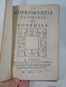 RONPHILE. La chyromantie naturelle de Ronphile. A Paris, Loyson, 1605. In-8, vélin du temps. Traité de chyromantie parmi les plus recherchés, s’intéressant aussi à l’astrologie. Selon Caillet, « C’est le meilleur traité qui existe »....