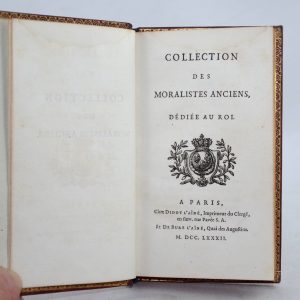 COLLECTION DES MORALISTES ANCIENS, dédiée au Roi. Paris, chez Didot, 1782. In-12, maroquin rouge, triple filet doré sur les plats, dos lisse orné, toutes tranches dorées. Rel. époque. Très bel exemplaire.