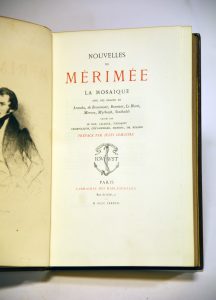 MÉRIMÉE (P) Nouvelles de MÉRIMÉE. La Mosaïque, avec les dessins de Aranda, de Beaumont,… Paris Iauaust, 1887. Grand in-8, maroquin janséniste tabac, couverture conservée, témoins. Bel exemplaire, sur grand papier d’Hollande. ...