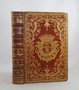 ALMANACH ROYAL, Année 1770. In-8, maroquin rouge aux Armes. Plaque Du Buisson, Armes de Jean Daniel Marquet, Seigneur de Montbreton, Gironde.
