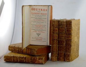 MAROT (Clément). - Les Œuvres. La Haye, chez P. Gosse & J. Neaulme, 1731, in-12, 6 Vol. au complet, plein parchemin de remploi, dos à nerfs, pièces de titre et de tomaison en cuir (reliure d'époque) Ex-Libris contrecollés sur les contreplats....
