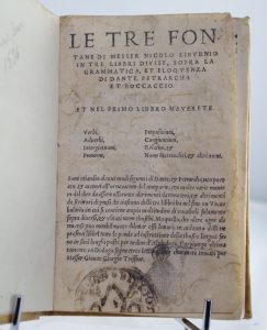 LIBURNIO (Niccolo) - Le Tre Fontane, sopra la grammatica et eloquenza di Dante Petrarcha, et Bocccaio. Venice, 1534. In-8, reliure de l'époque en vélin à rabats. Chanoine de Saint Marc et correcteur chez Alde, le Vénitien Niccolo Liburnio,...