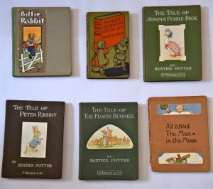 (ENFANTINA) LOT de 6 volumes, à savoir : Billie Rabit – The Tale of Jemina Puddle-Duck – The Tale of Peter Rabitt.- The Tale of Flopsy Bunnies – All about the Man in the Moon – Humpty Dumptys Little Son. Très bonne condition .