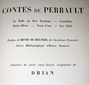 DRIAN. Contes de Perrault. •La Belle au bois dormant – • Cendrillon – •Barbe Bleue – •Peau d’Ane – •Les œufs. Préface de Henri de Régnier, illustré de seize eaux-fortes originales de DRIAN. Paris, La Roseraie, vers 1920....