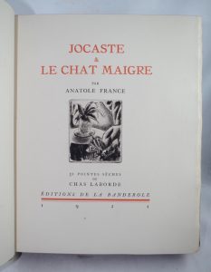 LABORDE (Chas) – France (Anatole)- Jocaste & le Chat Maigre. Illustré de trente et une pointes seches de CHAS LABORDE. Paris, Éditions de la Banderole, 1921. In-4. Reliure en plein maroquin verte olive. Les plats decorés de motifs poussés...