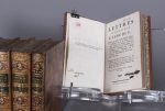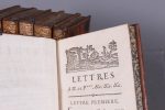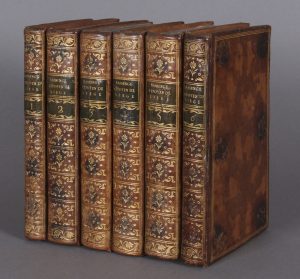 Six vol. in-8 (20 x 13), plein veau de l’époque, dos lisse décoré, pièces de titre en maroquin olive, triple filet d’encadrement aux plats, filet doré aux coupes, tranches jaspées.