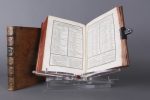 Plein veau marbré, dos à 5 nerfs, pièces de titre en maroquin rouge, pièces de tomaison en maroquin noir, compartiments décorés, tranches rouges.