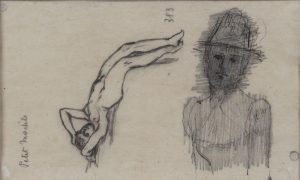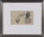 Dessin à l’encre et mine de plomb sur papier calque, 9,5 x 15,5. Titré au crayon à gauche. Dessin préparatoire à l’eau-forte du même nom. (Rouir, 631). Sous verre et passe-partout, dans un cadre argenté.