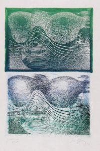 Joint : Marc LAFFINEUR. Inversion. 1974. Gravure sur bois en couleurs, 52 x 35. Signée, titrée et datée au crayon en dessous. Traces de manipulation. Joint : Marc LAFFINEUR. Sans titre. Technique mixte, 40 x 30. Signée et justifiée «6/71» en bas à droite. Sous Marie-Louise. Bel ensemble.