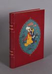 In-4 (27,5 x 20,5), plein maroquin rouge, dos à 4 nerfs, titre doré, 1er plat orné d’un grand médaillon mosaïqué bordé d’un motif doré, figurant une scène persane, filet doré aux coupes, cadre intérieur agrémenté de cercles à froid autour de rosaces mosaïquées, doublure et garde de soie à motif oriental, double garde, couverture et dos conservés.