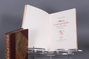 •FRANCE (Anatole). Les Contes de Jacques Tournebroche. Paris, Calmann-Lévy, 1909. In-8 (20,5 14,5), demi-chagrin et coins brun, dos à 5 nerfs, compartiments décorés, tête dorée. Un des 100 exemplaires sur vélin d’Arches suivant 1 exemplaire sur Japon et 60 sur Chine. Illustrations en couleurs de L. Lebègue.