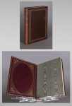 In-4 (28,5 x 21), plein maroquin brun, dos à 5 nerfs, quintuple filet d’encadrement aux plats dont 2 double filet bordant une bande de maroquin prune, motif répété aux compartiments, tranches dorées sur témoins, filet doré aux coupes, contre-plats de maroquin à décor prune, olive et brique de type art déco, double garde, Sous emboîtage bordé, doublé de feutrine. Reliure signée Dubois d’Enghien - Dooms.