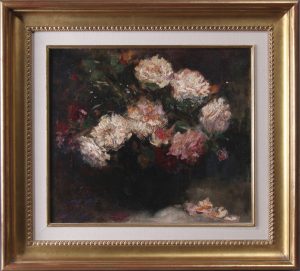 Signée en bas à gauche, dans un cadre orné, doré à champs de tissu beige.