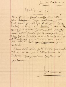 Précieux manuscrit d’un des Exercices de style (1947), dédié à M. Matarasso. Variation en pseudo-italien : « Oune giorne en pleiné merigge, ié saille sulla plateformé d’oune otobousse »...
