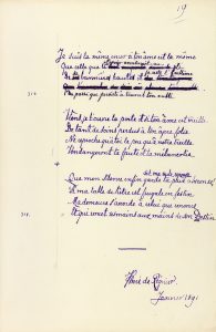 Beau manuscrit de ce « poème tragique » symboliste, en vers libres et alexandrins, publié dans la revue La Wallonie en janvier 1892, et recueilli dans Tel qu’en songe (Librairie de l’Art Indépendant, 1892). La page de tire porte la mention « Manuscrit N° 3 », raturée ultérieurement. Le texte présente de nombreuses corrections, une mise au net de 2 vers sur béquet, et deux additions plus importantes sur feuillets intercalaires. L’auteur a noté en marge le décompte des vers (318). Il a signé en fin et daté « Janvier 1891 ». Les personnages comprennent le Maître, la Gardienne, et deux Frères d’armes. Le poème commence par cette didascalie : « Une antique forêt sur une colline environne un vieux manoir en ruines parmi d’incultes jardins. Un seuil de pierre exhausse une lourde porte disjointe et close. Le Maître sort de l’un des sentiers de la forêt soutenu par ses Frères d’armes. L’action suit les phases du couchant. Le soleil décline derrière les arbres ; il effleure de jaunissantes cimes et les toits du manoir ». Les premiers vers sont dits par le Maître : « Ô forêts belles de solitaires automnes ! Mon enfance a tressé vos feuilles en couronnes Et vous avez vieilli d’aurores et d’automnes Et vous avez grandi sur l’oubli de mes pas »… Lugné-Poe en donna une version scénique au théâtre de l’Œuvre le 21 juin 1894, entre Frères d’Herman Bang et Créanciers d’Auguste Strindberg ; le programme était illustré par Vuillard : « tandis que des acteurs, derrière un rideau de gaze, évoluaient en silence sur la scène, des récitants dissimulés dans la fosse de l’orchestre lisaient leurs répliques » (J. Robichez) : Mlle Lara disait la Gardienne et Lugné-Poe le Maître. Henri de Régnier écrira à Gide, le 3 juillet : « Il s’est passé pour La Gardienne que, après une répétition générale excellente, la représentation fut quelque peu houleuse et finit presque en bagarre avec interruptions, clameurs et sifflets. Les mécontents étaient en minorité mais cela a fait un beau tapage ». Ex-libris Charles Hayoit.