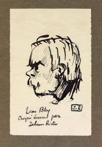 Caricatures à la plume, la plupart de profil, sauf indication contraire dans les légendes : * « Henry de Groux / Croquis. Souvenir par / Jehan-Rictus » (rehauts de crayon bleu). * « Paul Verlaine / croquis souvenir / par Jehan-Rictus ». * « Paul Verlaine / (vu de face) / Croquis souvenir par / Jehan-Rictus ». * « Madame Léon Bloy / Croquis souvenir / par / Jehan-Rictus ». * « Léon Bloy / croquis souvenir par / Jehan-Rictus ». * « Léon Bloy (vu de face) / croquis-souvenir / par Jehan-Rictus ».
