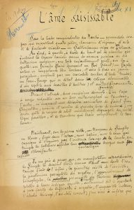 Un des chefs-d’œuvre de Saint-Pol-Roux et deux autres poèmes donnés au Mercure de France. L’Âme saisissable, magnifique poème en prose, daté « Saint-Henry, 91 », publié dans le Mercure de France de janvier 1892, et recueilli dans Les Féeries intérieures (1907), où il est dédié à Henri de Régnier. C’est le récit d’une scène de foire, où l’Âme du narrateur fascine (et est fascinée par) des Simples… Le manuscrit, soigneusement mis au net, présente cependant quelques ratures et corrections. « Sous les tuiles sanguinolentes du Marché – pyramidale carapace que supportent quatre piliers chamarrés d’ognons, d’ails et de foulards criards – un Saltimbanque érigea ses Tréteaux »... Les deux autres poèmes, de 5 quatrains chacun, sont écrits au dos de faire-part de mariage (Gustave Lang et Amélie Bélorgey [future femme du poète], 2 août 1890), et parurent dans le numéro du Mercure de France de mars 1892. Autre temps, autre Ophélie : « Ainsi qu’en les larmes du Saule Avec sa gerbe sur l’épaule Ophélie noya ses douleurs, Mon Cœur s’est noyé dans mes pleurs »… À la Fleur des fleurs : « Vous semblez un raisin de dame Héritière de l’arc-en-ciel »…